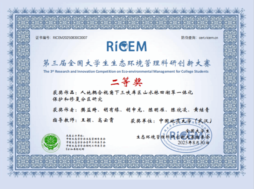 近日,第三届全国大学生生态环境管理科研创新大赛经过多轮评比,公布了比赛结果。由我们王颖老师与中国科学院地理所特别研究助理高云霄老师共同指导,我们学子樊益绮、胡有缘、胡申龙、陈明雁、陈烷凌及黄继青组成的“南望只此青绿”团队,凭借作品《人地耦合视角下三峡库区山水林田湖草一体化保护和修复分区研究》荣获全国二等奖。